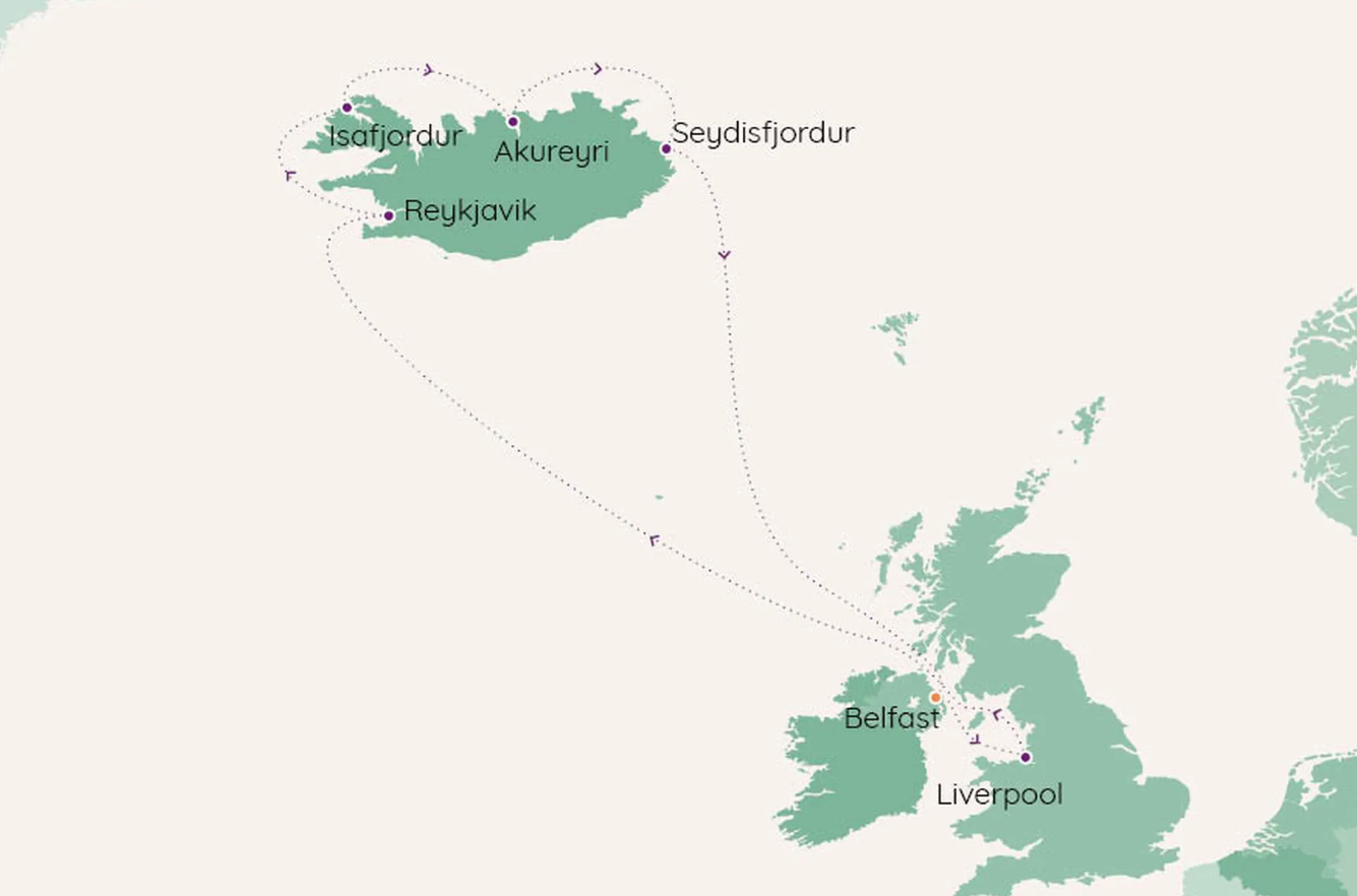 Ports of call: Belfast, Northern Ireland;Â Liverpool, England;Â Reykjavik, Iceland;Â Isafjordur, Iceland;Â Akureyri, Iceland;Â Seydisfjordur, Iceland;Â Belfast, Northern Ireland